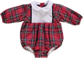 Body de menino em xadrez vermelho com gola peter pan branca.