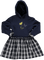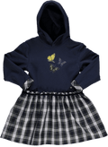 Vestido com capucho, transfer de borboletas e saia de xadrez.