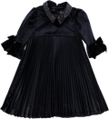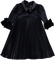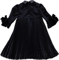 Vestido de veludo preto plissado, com mangas balão com laços e gola com brilhantes aplicados.