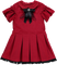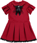 Vestido de veludo vermelho com laço preto no peito, gola peter-pan bordada, saia com pregas e mangas com folhos.