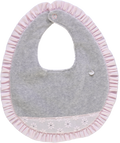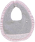 Descrição: Babete redonda cinza com encaixe de tecido e aplicação de folho rosa ao redor, aperta com sistema de mola.
