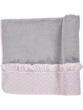 Manta de bebé cinzenta e rosa com bordado e folhos.