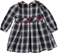 Vestido de bebé xadrez preto e branco com golas peter pan, cinto e laço vermelho.