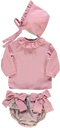 Conjunto de menina com top de malha rosa e saia com alças. O top simples de manga curta, tem pormenor de malha tricotada nas mangas, e na frente lindo estampado de ursinhos com balões. Aperta atrás com molas simples. A saia tem estampado de paisagem floral nos tons verde e rosa, alças que se cruzam atrás apertando com dois botões transparentes e dois laços grandes em cada lado da cintura. O interior da saia é todo forrado em algodão para criar o máximo conforto à menina.