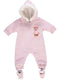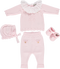 Conjunto de menina rosa, blusa branca com folhos rosa e cueca rosa com laço.