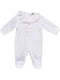 Babygrow rosa com folho na gola e detalhe de coração com folhos de renda.