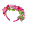 Bandolete forrada com tecido estilo Chanel rosa com flores em camadas feitas de fita de cetim e de organza rosa. Promenor de penas de lado e botão de pérola com brilhantes no centro e linda renda.