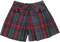 Calção de menina xadrez com cores predominantes em azul marinho e vermelho. No centro da frente, um macho e pormenor de dois bolsos falsos com botões forrados no centro em cor azul marinho. Prende atrás com fecho invísivel. A cintura é elástica e o calção é totalmente forrado com tecido de cor azul marinho.