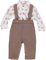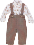 Conjunto de calças com alças e camisa de manga comprida. Calça castanha de alças com bolsos e de cinto elástico nas costas com detalhe de botões madeira. Camisa de manga comprida estampada , aperta na frente com sistema de botões de madeira.