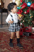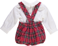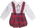 Conjunto de calções com alça com camisa de manga comprida. Calções em xadrez com alças cruzadas nas costas, detalhe de cinta elástica nas costas e detalhe de botões e prega na frente. Camisa de manga comprida com punho, detalhe de vivo na carcela da camisa e de botões forrados. Aperta com sistema de molas nas costas.