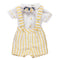 Conjunto camisa azul com riscas brancas e calções azul-marinho. A camisa de manga curta, confecionada com tecido de fibra de algodão azul com riscas brancas, aperta na frente com botões simples azul-marinho.Detalhe de pequeno bolso do lado esquerdo, com fita marinho e vermelho. Os calções de linho azul-marinho com bolsos de lado com botões marinho, tem cintura elástica com cordão vermelho que ajuda a regular a cinto e são forrados à cor para maior conforto do menino.