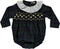 Body de menina cinza com tecido efeito escama de peixe com fios finos de brilho prata e padrão de bolinhas pretas. Mangas curtas. Gola folho com o mesmo tecido liso, com bordas de renda fina branca. Em baixo da gola, folhos nas laterais com o mesmo tecido da gola. O body tem as perneiras elásticas. Forrado, aperta atrás e no fundo com molas.