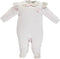 Body de menina-bebé com padrão escocês verde e azul escuro. O peito é formato ninho de abelha com bordado com flores e linhas amearelo e branco. A gola folho tem duas linhas em ponto aberto. O body é de perna curta, com perneiras elásticas, forrado, aperta atrás e no fundo com molas.