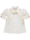 Camisa branca com gola peter-pan, com folho no centro e detalhes de renda de lurex dourada.