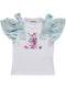 T-shirt branca com mangas balão azuis e estampa de Milkshake no centro.