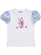 T-shirt branca com mangas verdes com laços no ombro e estampa de Milkshakes no centro.
