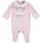 Este babygrow orgânico marfim para meninas, com gola Peter Pan cor-de-rosa, é verdadeiramente um símbolo de graça e beleza. O detalhe de bordado floral na frente, juntamente com a renda de cetim nas laterais, acrescenta um toque requintado a esta peça. É fechado com molas, garantindo facilidade de uso.