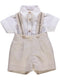 Conjunto de camisa branca com calções com alças, beges às riscas com pormenor de pregas macho.