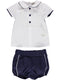 Conjunto de camisa branca com nervuras e renda no peito, conjunta com calção azul claro de linho com listra branca.