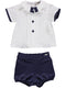 Conjunto de camisa branca com papillon e carcela em contraste, combina com calções verdes longos.