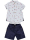Conjunto de menino amarelo composto por camisa às riscas com padrão de barcos e calção branco com bolsos de laterais. Detalhe de cordão na cinta.
