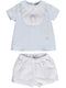 Conjunto de menino composto por calção beige com franzido na bainha e camisa branca com nervuras na frente e detalhes beiges.