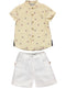 Conjunto de menino azul composto por camisa às riscas com padrão de barcos e calção bazul marinho com bolsos de laterais. Detalhe de cordão na cinta.