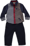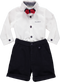 Conjunto de camisa branca com vivos contrastantes nos punhos, a combinar com os botões. Calções xadrez na cor castanha com barra italiana. Bolsos faca e vivos nas bordas, como nos punhos da camisa. Elástico na traseira do cós e aperto na frente com fecho e botão.