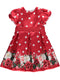 Vestido de menina azul de tecido às bolas com cinto e detalhe de laço duplo aplicado no peito.