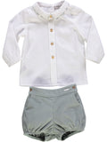 Conjunto de bebé menino composto por camisa branca e calção bombazine verde.